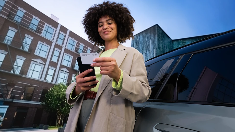 V závislosti na Vaší zemi, modelu a výbavě Vašeho MINI s MINI Operačním systémem 9 můžete své MINI pomocí MINI Digitálního klíče Plus odemknout a nastartovat prostřednictvím výbavy Teleservices (6AE) a Komfortního přístupového systému (322) telefonem nebo hodinkami, které klíč podporují. Pokud Vaše země a mobilní zařízení podporují pásmo UWB, Vaše MINI se při přiblížení automaticky odemkne. Další komfortní funkce jsou k dispozici ve Vašem telefonu nebo hodinkách a v aplikaci MINI. Pro spuštění motoru stačí, aby se Vaše mobilní zařízení nacházelo v uvnitř vozu. Pokud není pásmo UWB podporováno, přenos dat probíhá prostřednictvím technologie NFC (Near Field Communication), takže pro spuštění motoru je nutné přiložit chytrý telefon nebo hodinky ke klice dveří a umístit je do držáku chytrého telefonu.